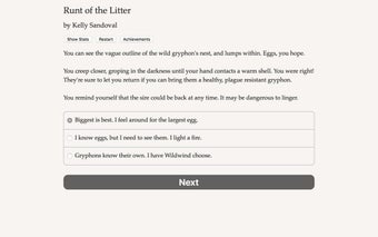 Runt of the Litter är en interaktiv fantasy roman som låter spelare ta kontroll över en unik berättelse där de stjäl och uppfostrar en baby gryffon. Med en textbaserad struktur på ord, erbjuder spelet ett djupt och engagerande narrativ där varje val påverkar berättelsens utveckling. Spelare kan välja att slåss mot drakar för att rädda imperiet eller att leda sitt folk mot frihet, vilket skapar en dynamisk spelupplevelse.